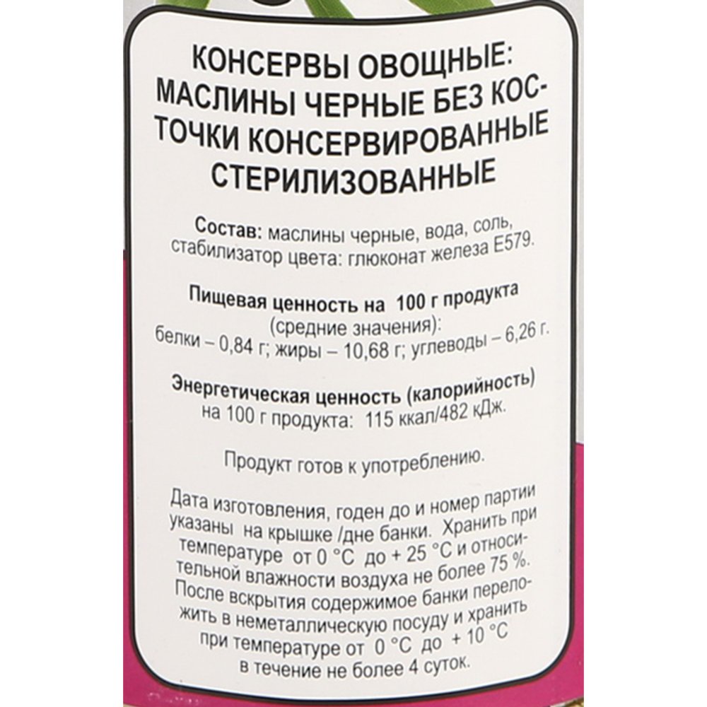 Состав | маслины черные, вода, соль пищевая поваренная, стабилизатор цвета: глюконат железа Е579. |