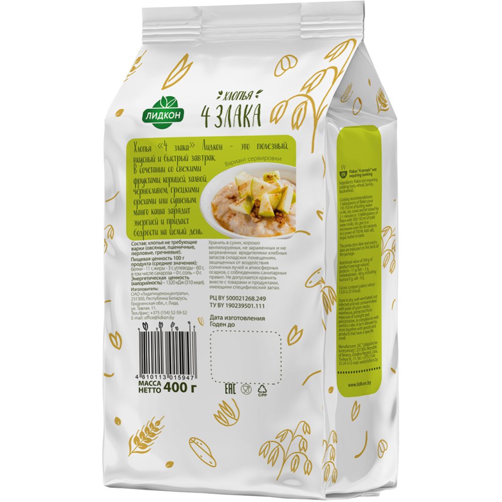 Состав | хлопья не требующие варки (овсяные, пшеничные, перловые, гречневые). |