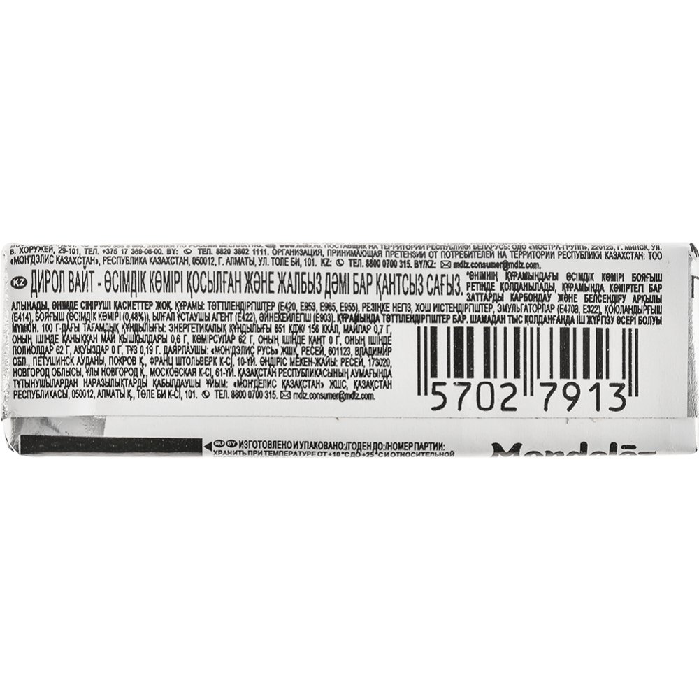 Состав | подсластители (Е420, Е953, Е965, Е955), резиновая основа, ароматизаторы, эмульгаторы (Е470а, Е322), загуститель (Е414), краситель (уголь растительный (0,48%)), агент влагоудерживающий (Е422), глазирователь (Е903). |