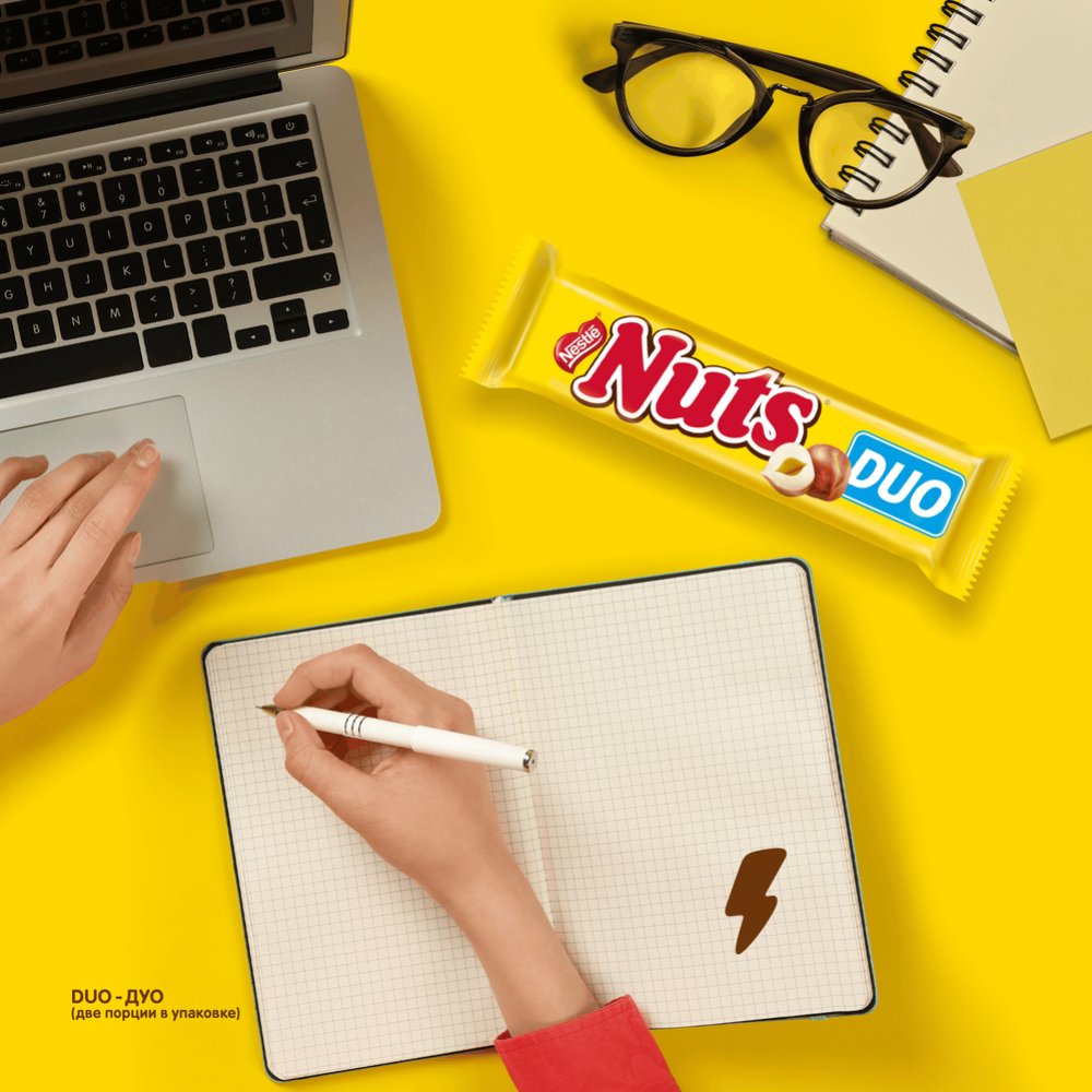 Краткое описание | Шоколадный батончик Nuts Duo с цельным фундуком, карамелью и нежной нугой, покрытый молочным шоколадом. Компания «Нестле» является одним из крупнейших производителей в таких кондитерских категориях, как шоколадные плитки, батончики, конфеты в коробках и жевательный мармелад. Внеся значительный вклад в историю развития шоколада, мы продолжаем радовать наших потребителей, предлагая широкий ассортимент любимых вкусов. |