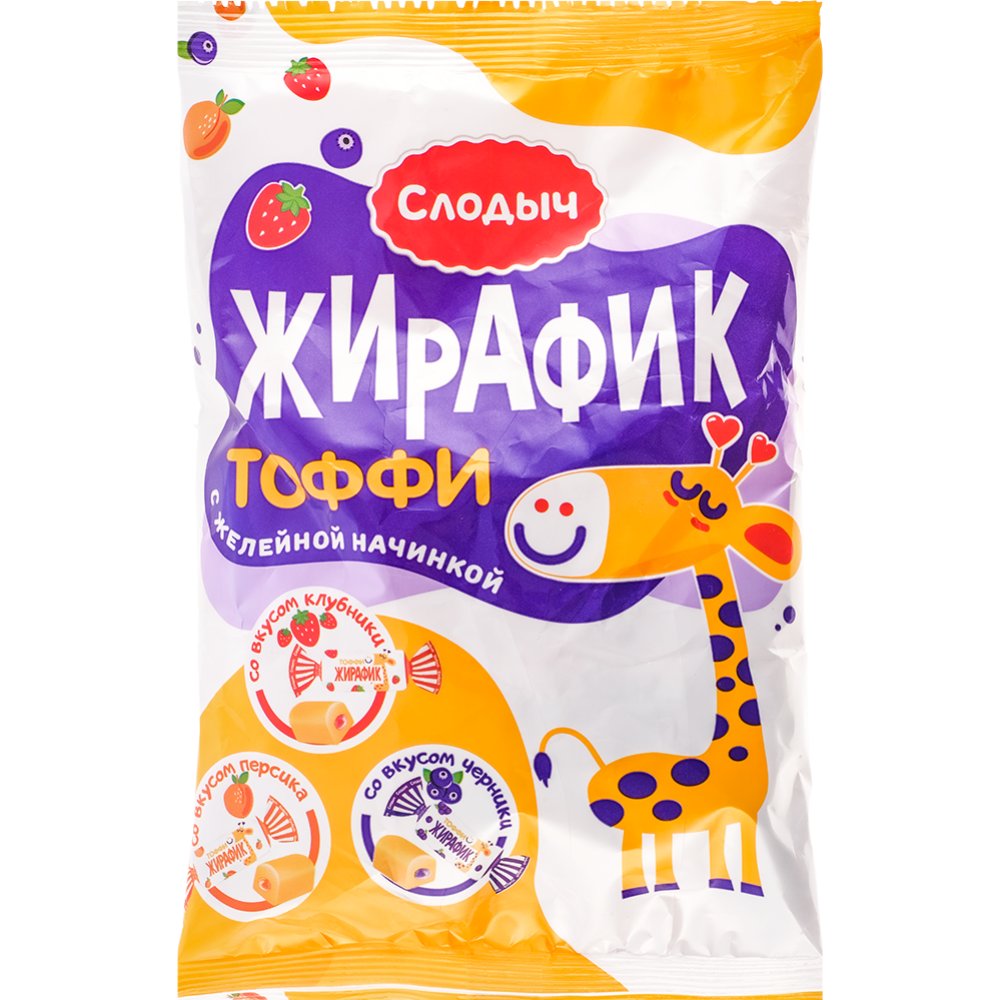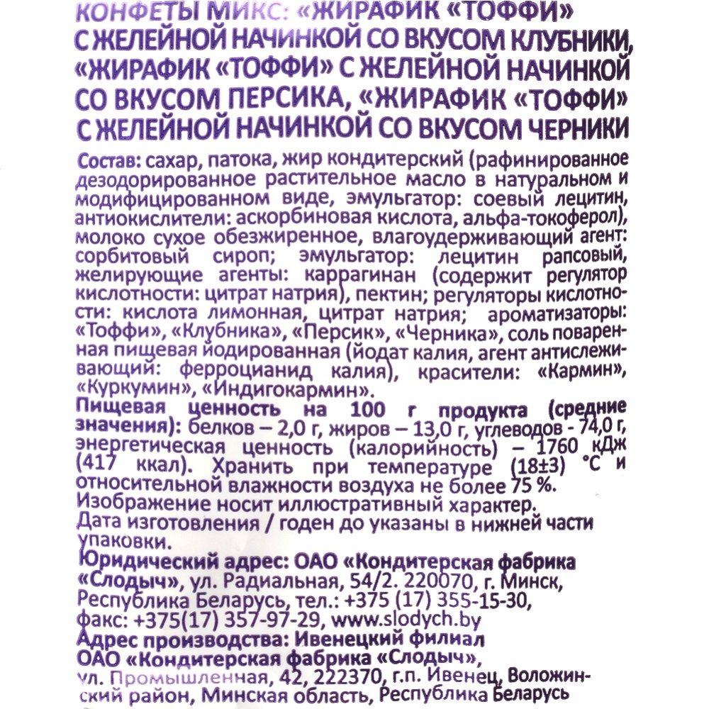 Состав | сахар, патока, жир кондитерский (рафинированное дезодорированное растительное масло в натуральном и модифицированном виде, эмульгатор: соевый лецитин, антиокислители: аскорбиновая кислота, альфа-токоферол), молоко сухое обезжиренное, влагоудерживающий агент: сорбитовый сироп; эмульгатор: лецитин рапсовый, желирующие агенты: каррагинан (содержит регулятор кислотности: цитрат натрия), пектин; регуляторы кислотности: кислота лимонная, цитрат натрия; ароматизаторы: «Тоффи», «Клубника», «Персик», «Черника», соль поваренная пищевая йодированная (йодат калия, агент антислеживающий: ферроцианид калия), красители: «Кармин», «Куркумин», «Индигокармин». |