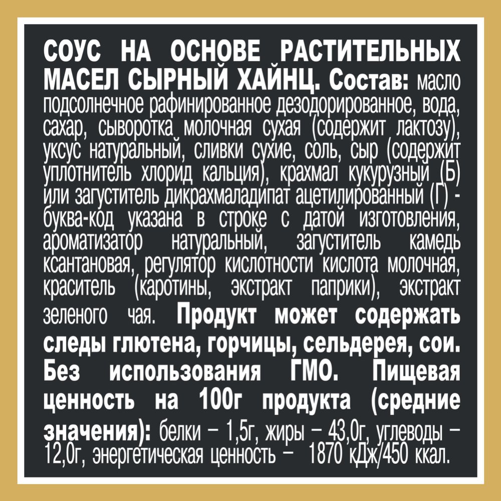 Состав | масло подсолнечное рафинированное дезодорированное, вода, сахар, сыворотка молочная сухая (содержит лактозу), уксус натуральный, соль, сыр (содержит уплотнитель хлорид кальция), сливки сухие, крахмал кукурузный или загуститель дикрахмаладипат ацетилированный, ароматизаторы натуральные, загуститель камедь ксантановая, регулятор кислотности кислота молочная, экстракт зеленого чая, красители (экстракт паприки, куркумин). |