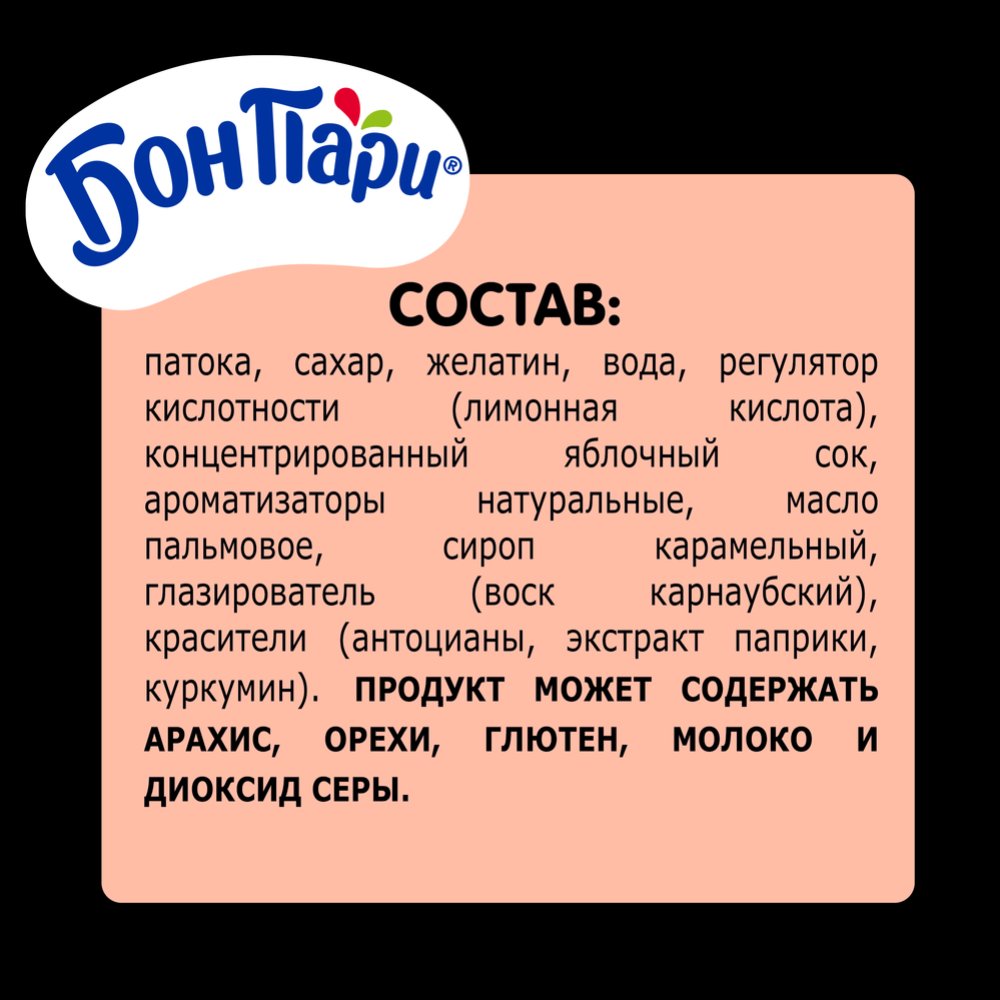 | Состав | Патока, сахар, желатин, вода, регулятор кислотности (лимонная кислота), концентрированный яблочный сок, ароматизаторы натуральные, масло пальмовое, сироп карамельный, глазирователь (воск карнаубский), красители (антоцианы, экстракт паприки, куркумин). Продукт может содержать арахис, орехи, глютен, молоко и диоксид серы. |