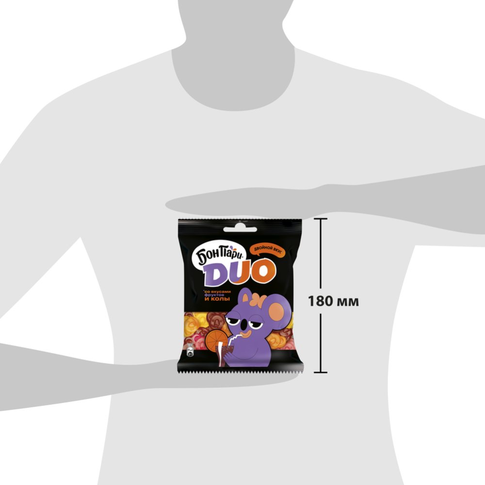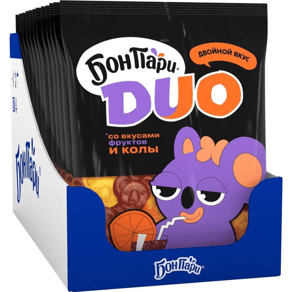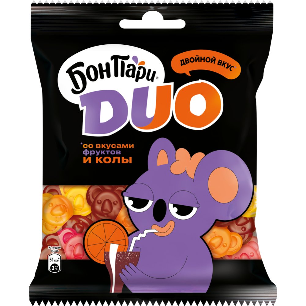 | Краткое описание | Жевательный мармелад Бон Пари® Дуо в форме джоуи - детенышей коала. Мармелад Бон Пари® Дуо для тех, в ком жив ""внутренний ребенок"": забавная жевательная ""провокация"" в форме сдвоенных мордочек коала со вкусом колы, апельсина и лимона. Замиксуй вкусы, соедини две фигурки и получишь фруктовую колу! Упаковку 100г удобно взять с собой или разделить с друзьями. Cледите за рекомендуемой порцией сладкого. Одна порция: две дуо-мармеладки. Мармелад Бон Пари® Дуо. Сладкий джоуи производится без добавления искусственных красителей. В производстве используется концентрированный фруктовый сок. |