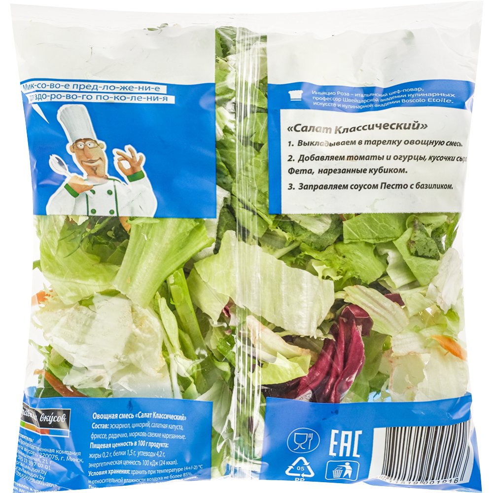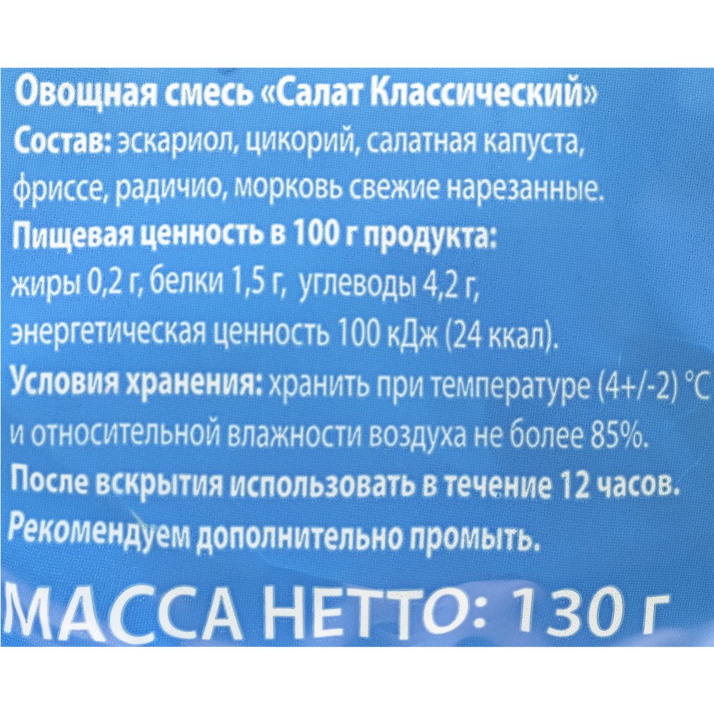 Состав | эскариол, цикорий, салатная капуста, фриссе, радичио, морковь свежая нарезанная. |