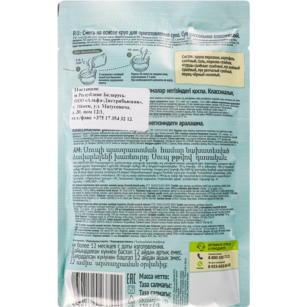 Состав | крупа перловая, картофель кубик сушёный, соль поваренная пищевая, морковь сушёная, огурцы солёные сушёные резанные, лук зелёный сушёный, лук сушёный, перец чёрный молотый. |