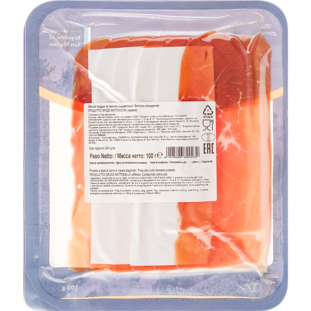 | Краткое описание | Мясной продукт из свины, вакуумная упаковк. Prosciutto Crudo "Matonella" — вкуснейший сыровяленый окорок, который тщательно натирается солью и подвергается термической обработке. Весь процесс производства занимает несколько месяцев. Прошутто Крудо "Матонелла" позволяет познакомиться с изысканным вкусом итальянских мясных деликатесов. Его изготавливают из свиного окорока. |