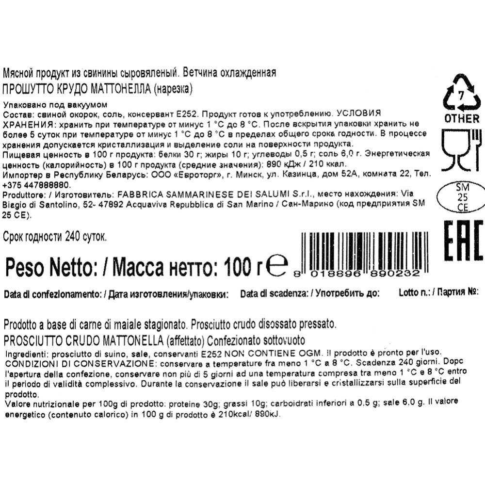 | Производитель | Фаббрика Саммаринесе Деи Салуми С.р.л., Виа Биагио ди Сантолино, 52- 47892 Аcкуавива Репубблиcа ди Сан Марино, Сан Марино. |