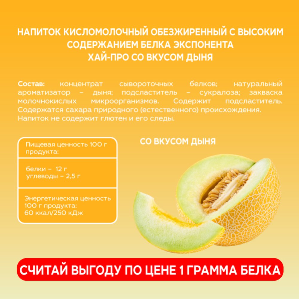 | Состав | концентрат сывороточных белков; натуральные ароматизатор – дыня; подсластитель – сукралоза; закваска молочнокислых микроорганизмов. Содержит подсластитель. Содержатся сахара природного (естественного) происхождения. |