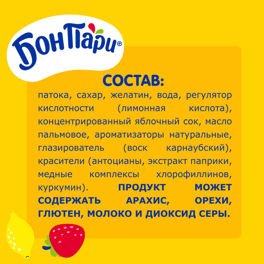 Состав | патока, сахар, желатин, вода, регулятор кислотности (лимонная кислота), концентрированный яблочный сок, ароматизаторы натуральные, масло пальмовое, красители (антоцианы (получен из моркови), экстракт паприки, куркумин, медные комплексы хлорофиллинов (получен с использованием растительного сырья)), глазирователь (воск карнаубский).Продукт может содержать арахис, орехи, глютен, молоко и диоксид серы. |