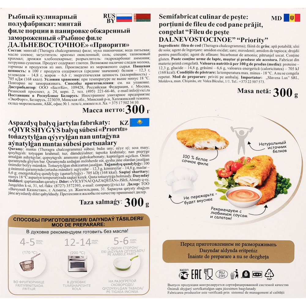 Состав | минтай филе, мука пшеничная, вода питьевая, масло соевое, загуститель: крахмал окисленный, соль, специи, тапиоковый крахмал, дрожжи хлебопекарные, разрыхлитель: гидрокарбонат аммония, петрушка сушеная. |