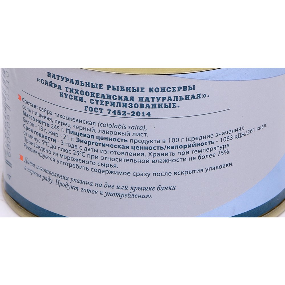Состав | сайра тихоакеанская, соль пищевая, перец черный, лавровый лист. |